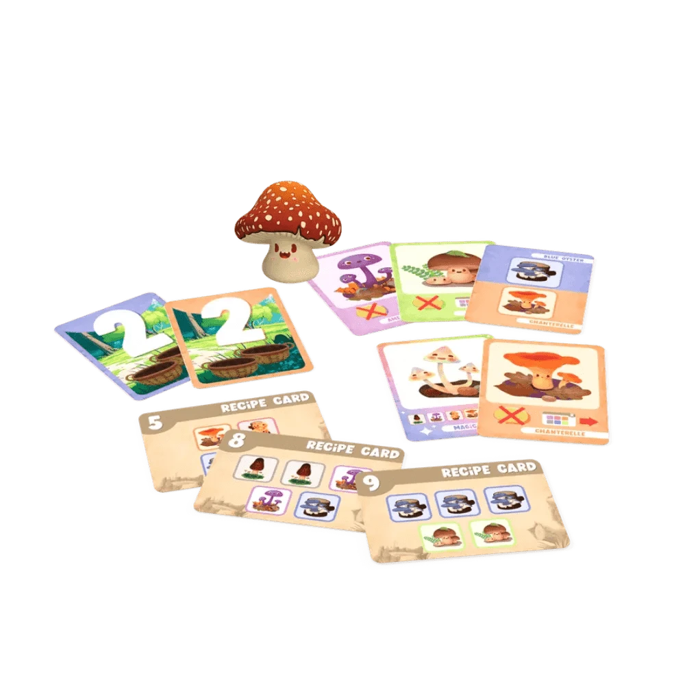 A whimsical family card game where you’ll embark on a journey through a magical forest filled with diverse mushrooms. Bid to get the first pick for each round. You’ll work to complete your recipe cards to score the most points and win!