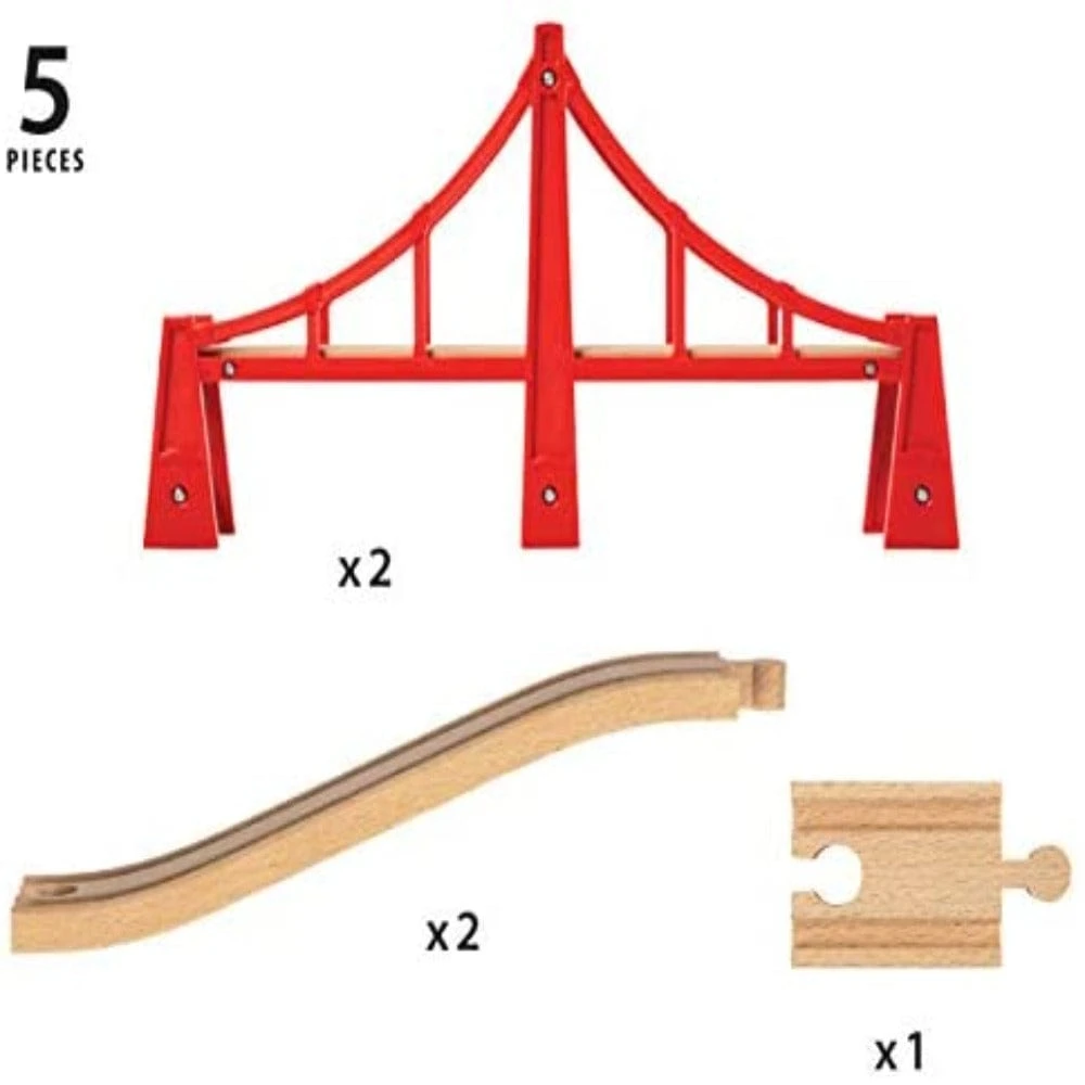 - Comes with 5 pieces including two bridges and three wooden track pieces.