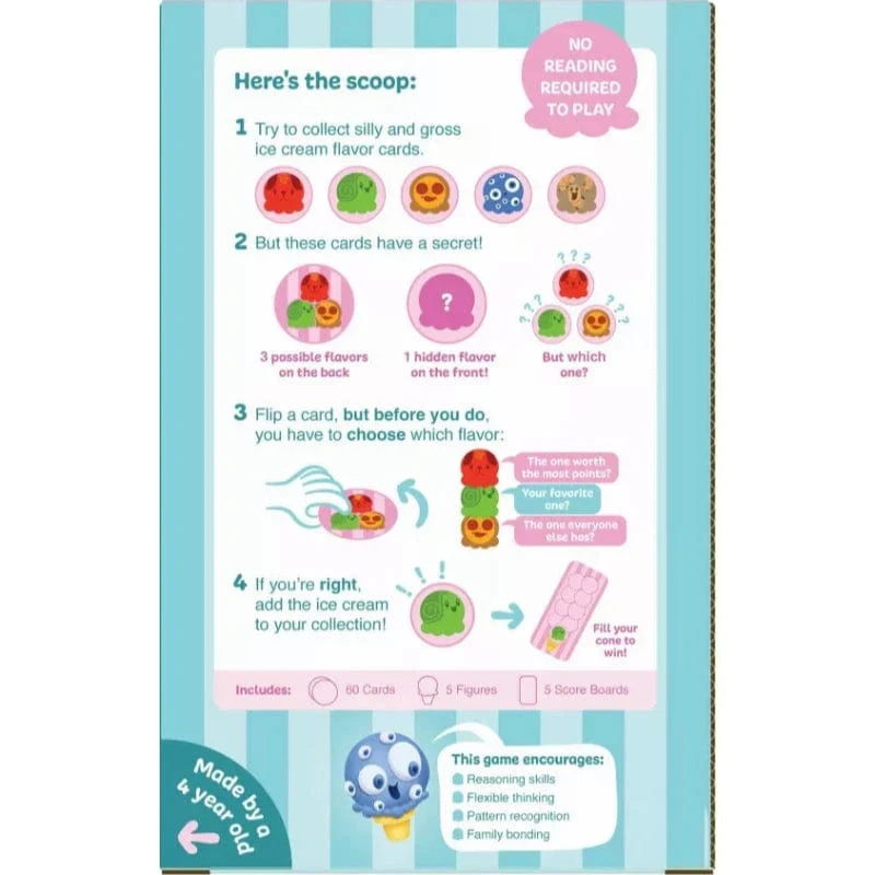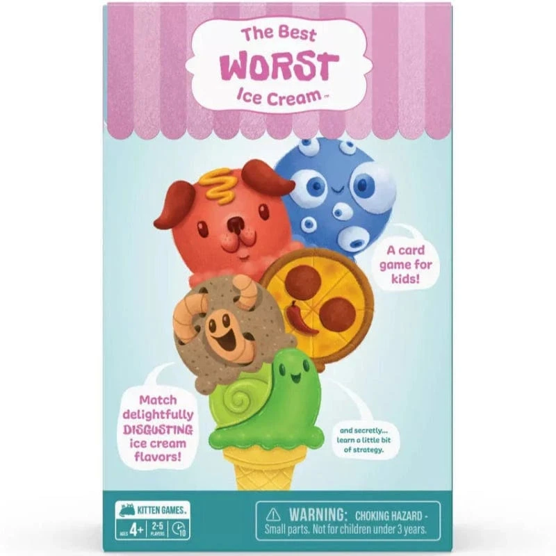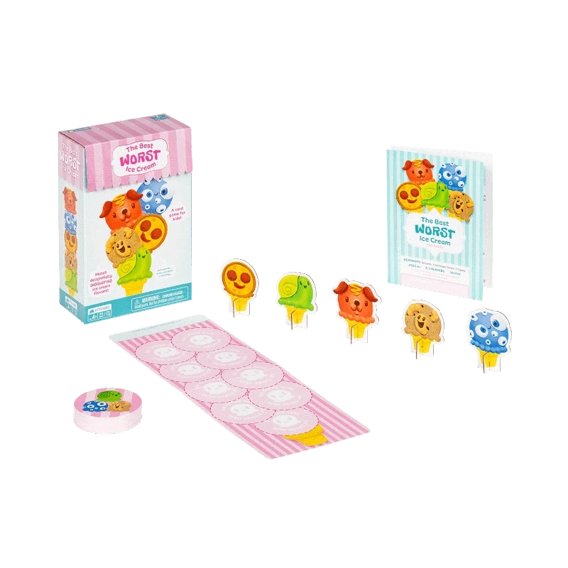 The Best Worst Ice Cream lets kids improve their decision-making skills while building the kookiest Ice Cream Cone! They’ll use reasoning and creative thinking to match flavors and fill their Ice Cream Cone, and you’ll have fun playing along. The Best Worst Ice Cream is easy to learn and fast to play with funky flavors that spark creative conversations.Â