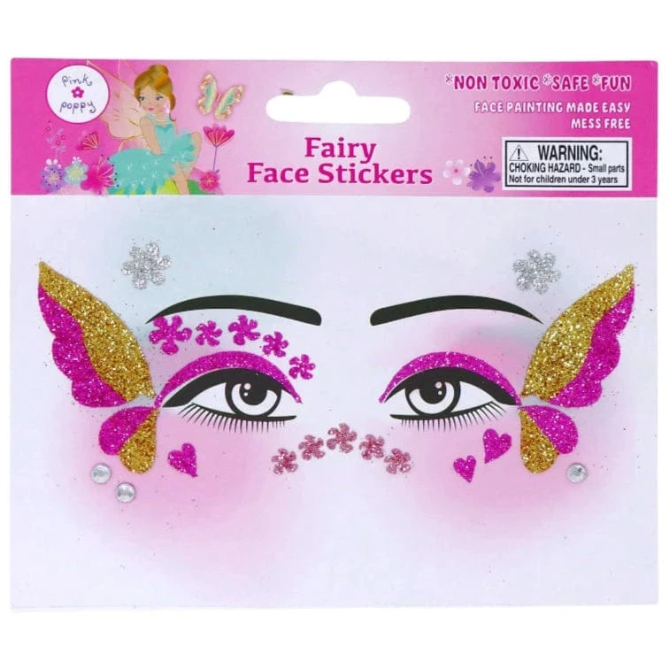 Pink Poppy’s Fairy Butterfly Friends Face Stickers are a non-toxic and mess-free alternative to face painting. Transform into a beautiful Fairy Butterfly with these captivating pink and gold glittering stickers. Application is quick and effortless, simply peel the sticker off the backing card and apply it to your face.Â