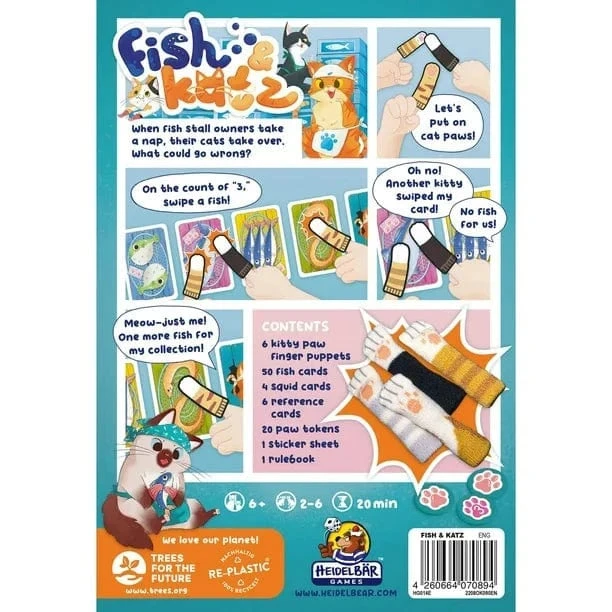 Unleash your inner feline with Fish & Katz, the fast-paced reaction game by designer Benjamin Leung. This Asian fish market themed game features adorable cats, delicious fish, and a cat paw finger-fashioned outfit for added fun.Â