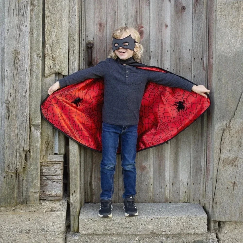 Our multi-award-winning design is perfect for little superheroes everywhere! This adorable reversible cape offers twice the fun with quality design and versatility. The black satin side feature a yellow bat emblem and reverses to a red spider web satin print on the reverse side with large black velour foam spider details. The Velcro closure at the neck makes switching superheroes a breeze.