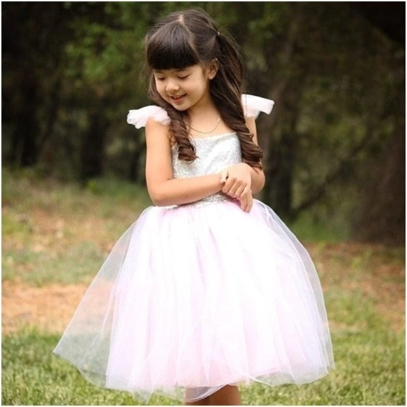Be a perfect princess in this sparkle and shine pink tutu dress. With 2 layers of soft pink tulle and a layer of iridescent glitter tulle, your skirt will always be fluffy and bright. The sequin top is made from iridescent sequins with a soft stretch spandex lining. The straps are made with stretch spandex and feature tulle puffs. A small satin bow detail finishes this adorable princess dress with a touch of class.