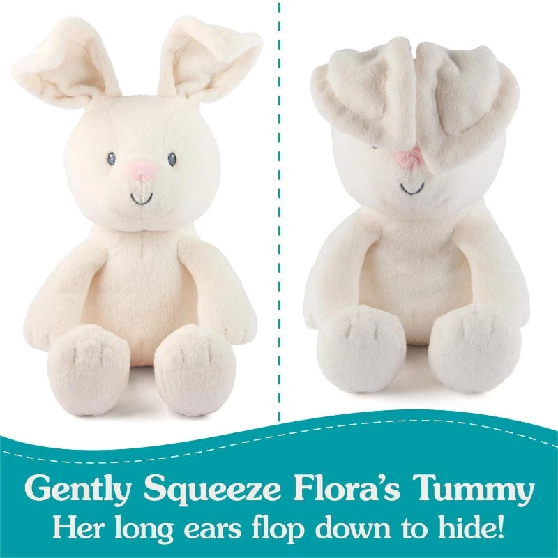 Flora is here in an all-new format! This classic award-winning plush bunny is here in a smaller, travel-friendly size with a simpler squeeze-and-play feature that everyone can use to play peek-a-boo with baby. Simply press her tummy with a gentle squeeze and her ears flop downward, covering her eyes to hide and leaving you in control of the game. Her long ears then pop back up as soon as you release the pressure, letting you decide when the surprise occurs. Customize every peek-a-boo session to your little one`s preferences and speed, using Flora to bond in a whole new way! Flora`s new 7 size and floppy limbs enable her to sit upright for display or let her legs dangle down playfully, making an adorable baby shower gift and cuddly soft toy. This innovative baby toy was also made thoughtfully, with the whole family in mind: with only minimal pressure needed to press her tummy, everyone can play comfortably and easily, from siblings all the way to grandma!