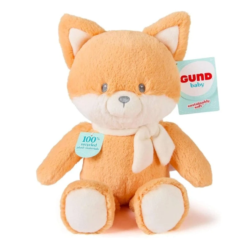 This adorable, sustainably made fox has irresistibly soft pastel orange plush, a cream-colored scarf around its neck, and a modern design that seamlessly complements nursery decor. Piper is crafted from recycled materials, from the packaging to the stuffing inside. Baby GUND is proud to introduce our first line of sustainably soft friends, sourced from 100% recycled materials! Each friend is crafted with luxuriously soft recycled plush, fiber fill, thread, and pre-consumer recycled beads.