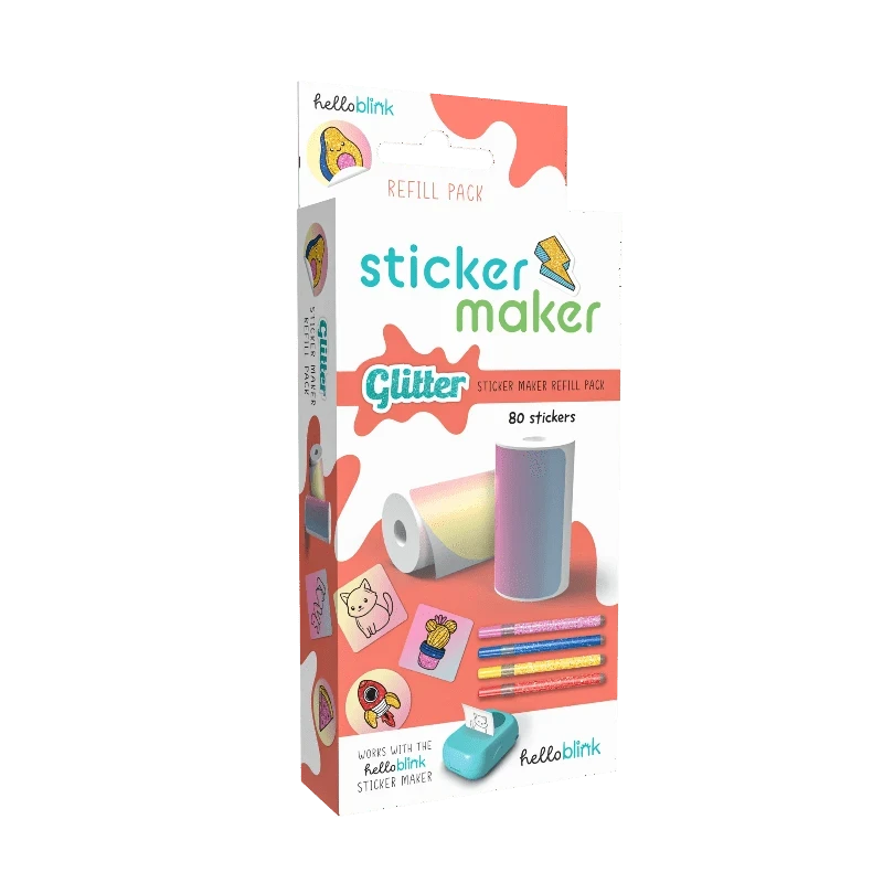 Hello Blink Sticker Maker Glitter Refill Pack is to be used with the Hello Blink Sticker Maker for children. The pack contains 80 glitter stickers in round and square shapes. Create and print customized stickers with just three easy steps, load the paper, download the app and print. With Hello Blink there is no ink required. Upload your own designs or select from our library of images then color your stickers to create customized and personalized art that can be used anywhere.