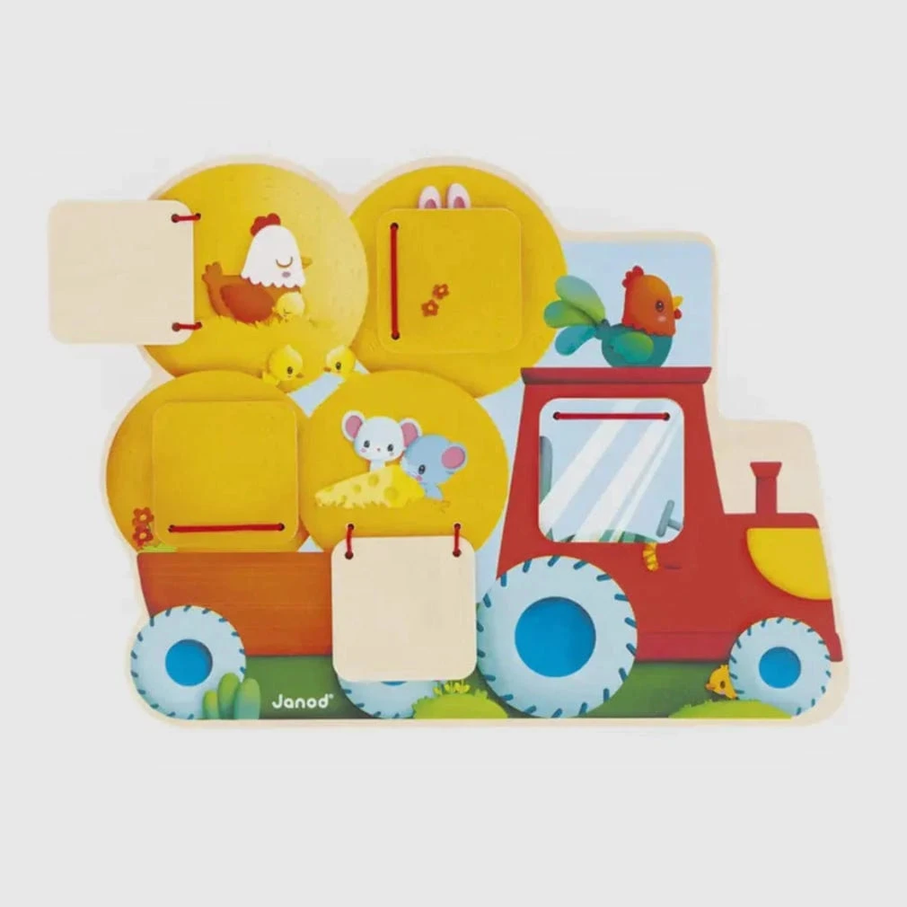 Uncover farm animals with this delightful wooden puzzle! Kids fit the 5 pieces onto the board, grabbing the studs for an easy hold. Each animal piece features a texture that feels like its real fur. The set includes five little animals: a rabbit, hen, cow, sheep, and donkey. Once all pieces are in place, your child can explore the textures beneath each animal for a fun and tactile way to learn!