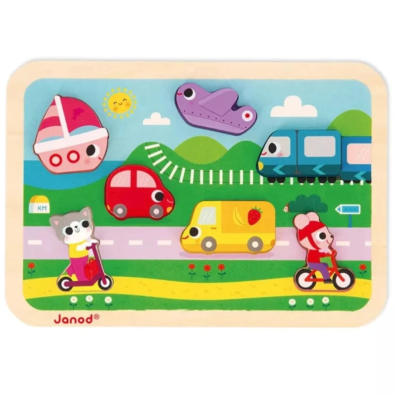 This early-learning comprises 7 thick pieces that can easily be grasped by little hands. Each piece of the puzzle has been specifically designed to represent different means of transport: a plane, train, boat, car, lorry, scooter and bicycle. And that’s not all! The pieces can also be used as figurines to extend playtime and stimulate your child’s imagination.