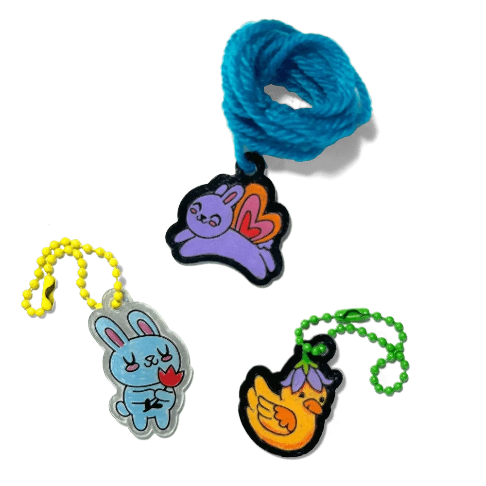 The world’s cutest crew is here! Shrink-Its Cute Crew provides the perfect dress-up set for your backpack, keychain, and even door. Just color in the 20 lightweight plastic characters – from the smiling ice cream to the happy bee – with colored pencils or markers, pop them in the oven, and watch them shrink in just 60 seconds! Strut their stuff on one of the three included colored cords or five differently colored ball chains. Get this adorable shrink art kit now!