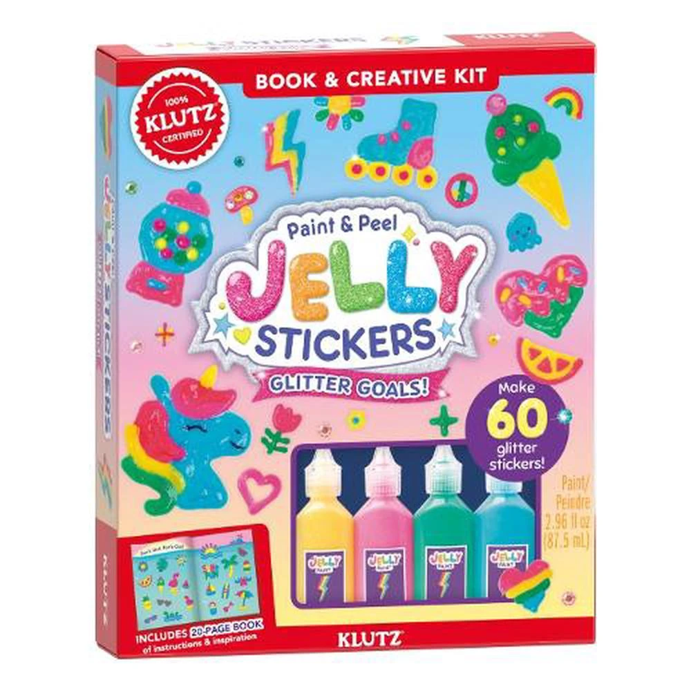 Use glitter jelly paint to trace sticker designs from frogs to flowers to flamingos and more! These stickers are removable and reusable, making it easy to style and re-style your stuff again and again. Use them to glitter up your gadgets, phone cases and tech screens. They also make great window clings that sparkle in the sun! A new twist on the bestselling Klutz PAINT & PEEL JELLY STICKERS – now with glitter jelly paint! Includes a 20-page book of crystal clear instructions and 60 sticker designs. Embellish your stickers with rhinestones and sequins. Use 4 colors of jelly paint to trace the art in the book. The dry stickers cling to smooth surfaces and are water-resistant. Comes with a mini marker and custom tool to help you add details and peel your final stickers off the tracing sheet.