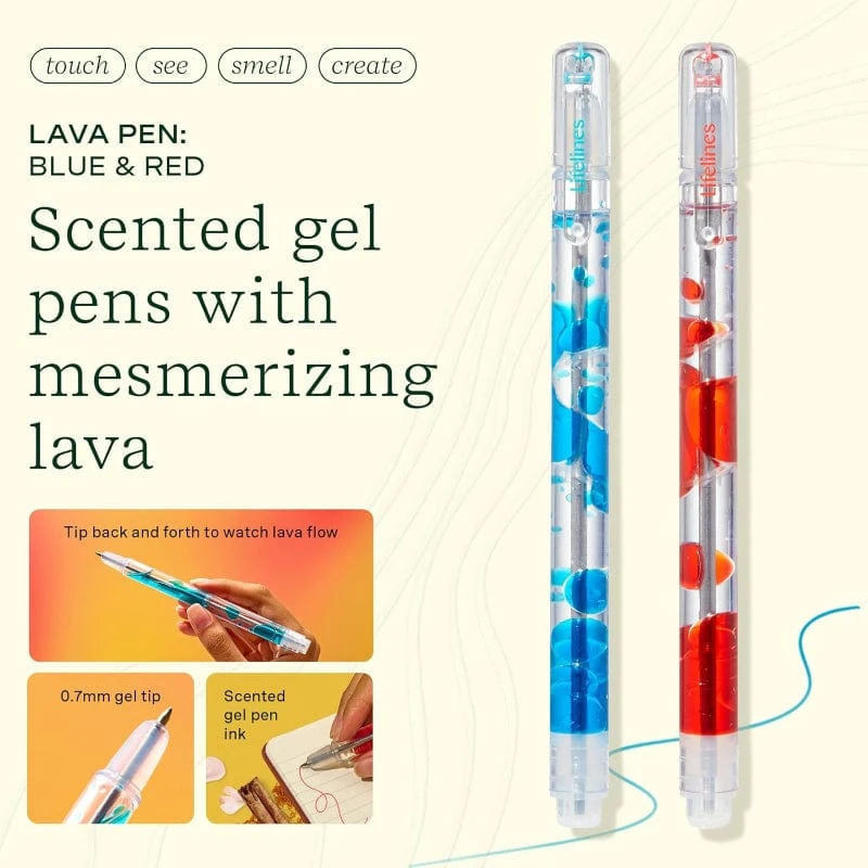 These mesmerizing pens are such a calming sensory experience! Tip the pen to watch the colorful, smooth “lava” flow back and forth. When you write, the delightfully scented ink, made with essential oil blends, leaves behind a refreshing aroma. Blue “fresh” ink has notes of corn mint, rose, garden mint, and grapefruit; red “spicy” has notes of cinnamon, clove, carnation, and ylang-ylang.