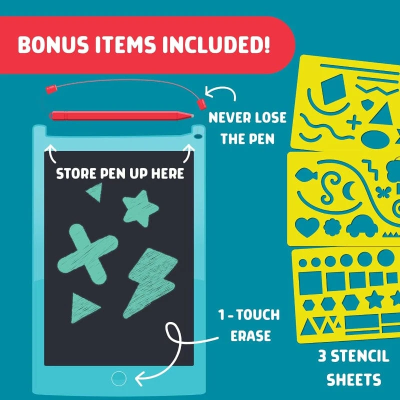 - Includes: Scribble Glow LCD Doodle Board, 3 Stencils, Teathered Stylus