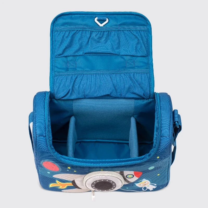Blast Off through the galaxy with your Tonies! You want to take your Toniebox, Tonies, headphones, charging station and other treasures with you on a trip? No problem! With the Listen + Play Bag you can easily transport your beloved Tonies collection in one bag! Whether you have a long journey with your family or a short car ride to the park and you just can’t wait for Tonie time, don’t worry about unpacking all your Tonies in the car / train / plane. You can simply open the loudspeaker flap and pop a Tonie on the Toniebox, for easy fun on the go!