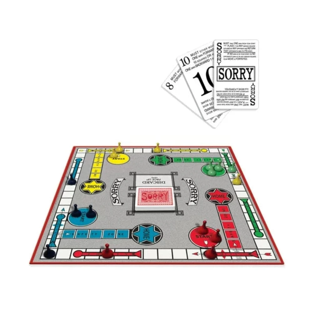 - 16 iconic Sorry pawns, Deck of 44 cards with classic artwork, and Illustrated instructions